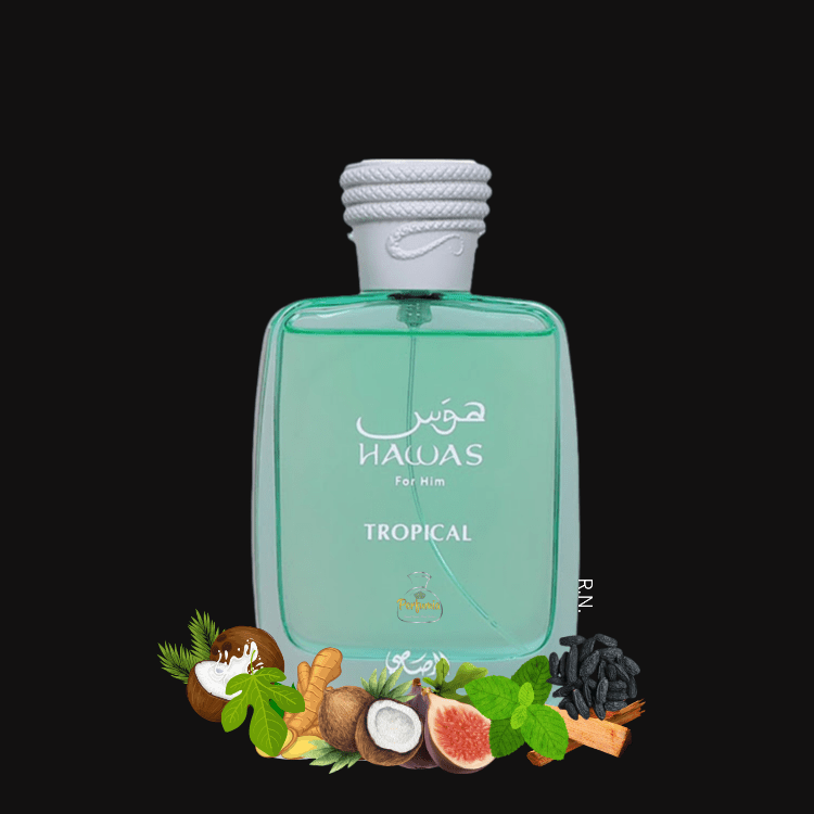 Hawas for Him Tropical by Rasasi is an Eau de Parfum for men introduced in 2025 as part of the Hawas collection. This fragrance is characterized by a sparkling and radiant composition, inspired by the idea of a tropical escape. The scent opens with invigorating notes of fig leaf, coconut water, and ginger, leading to a heart of coconut, fig, and mint. The base is composed of tonka bean, musk, and sandalwood, providing depth and a smooth finish. Hawas Tropical is described as aromatic, green, and woody, making it suitable for daytime wear.